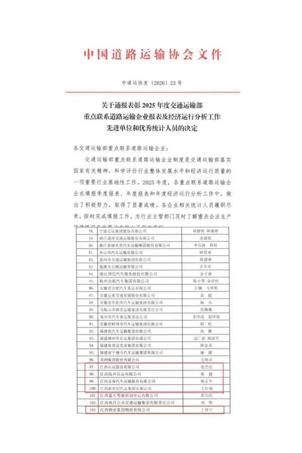 近日,中国道路运输协会发文,对2025年度交通运输部重点联系道路运输企业报表及经济运行分析工作先进单位和个人予以通报表彰。我会共有5家会员单位及其相关统计人员荣获先进称号。